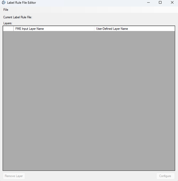 A label rule file is edited using the Label Rule File Editor. This external application is used to add label definitions to a new label rule file or update existing ones. To open the Label Rule File Editor, enter in the Windows search box “Label Rule File Editor” and click it when it appears. This will open the following dialog: