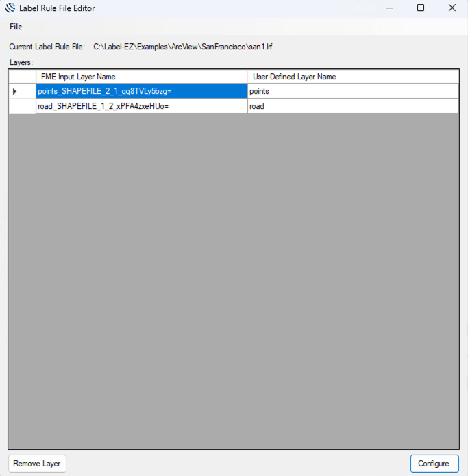To remove a layer from the label rule file, select a row in the Layers grid and click the Remove Layer button.