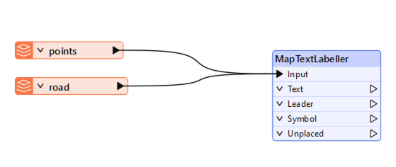 Starting in FME 2025, there is only one input port on the MapTextLabeller named Input. All incoming connections are connected to this single port. Each incoming connection’s set of features fall into a FME layer identified either by the connection’s source reader name or source transformer name. The following example depicts this: