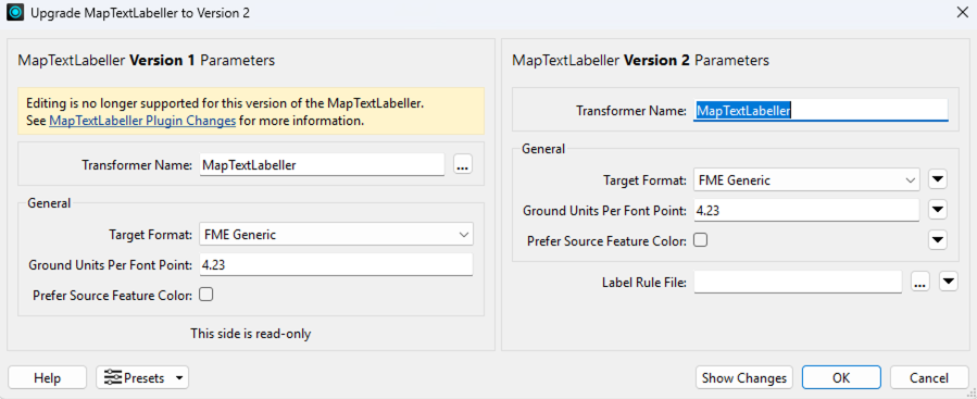 The MapTextLabeller instances in a workspace that were created in FME Form 2024 or older are not editable in FME Form 2025 and newer; however, these instances will still run during FME translations. To enable these instances to be editable in FME Form 2025 and newer, upgrade each instance by right-clicking on each MapTextLabeller and clicking on the Upgrade Transformer option in the pop-up menu. This will open the following dialog: