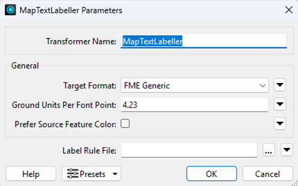 The following dialog appears when the MapTextLabeller’s Properties button is clicked in FME Form.